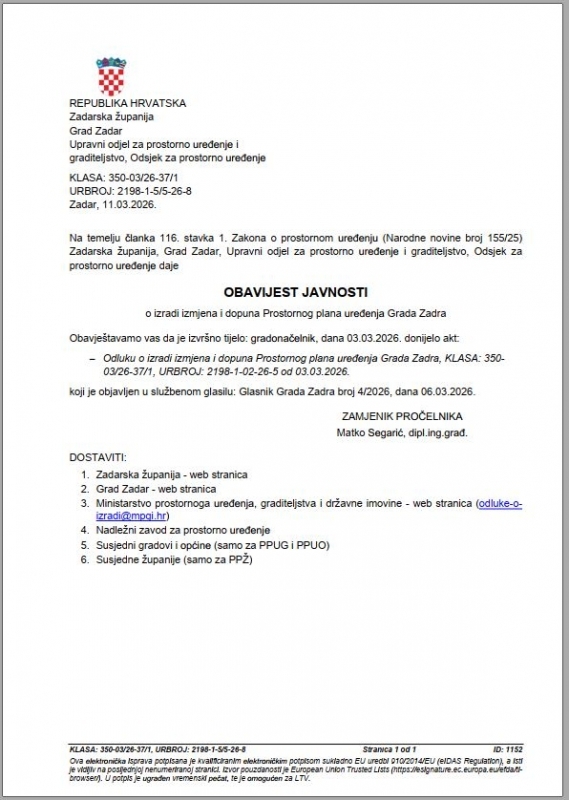 Prostorno planiranje Arhiva: 10. sjednica Gradskog vijeća Grada Zadra Planovi na snazi U izradi Na javnoj raspravi Planovi u primjeni Natrag OBAVIJEST JAVNOSTI o izradi izmjena i dopuna Prostornog plana uređenja Grada Zadra OBAVIJEST JAVNOSTI o izradi izmjena i dopuna Prostornog plana uređenja Grada Zadra Natrag Objavljeno 11. ožujka 2026. 15:15 Ispiši