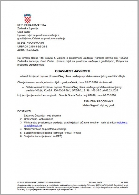 Prostorno planiranje Arhiva: 10. sjednica Gradskog vijeća Grada Zadra Planovi na snazi U izradi Na javnoj raspravi Planovi u primjeni Natrag OBAVIJEST JAVNOSTI o izradi izmjena i dopuna Urbanističkog plana uređenja sportsko-rekreacijskog središta Višnjik OBAVIJEST JAVNOSTI o izradi izmjena i dopuna Urbanističkog plana uređenja sportsko-rekreacijskog središta Višnjik Natrag Objavljeno 11. ožujka 2026. 15:13 Ispiši