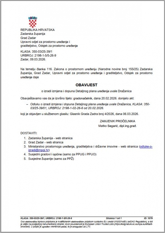 Prostorno planiranje Arhiva: 10. sjednica Gradskog vijeća Grada Zadra Planovi na snazi U izradi Na javnoj raspravi Planovi u primjeni Natrag OBAVIJEST o izradi izmjena i dopuna Detaljnog plana uređenja uvale Dražanica OBAVIJEST o izradi izmjena i dopuna Detaljnog plana uređenja uvale Dražanica Natrag Objavljeno 09. ožujka 2026. 14:30 Ispiši