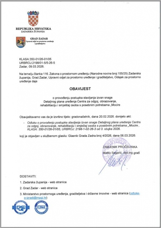 Prostorno planiranje Arhiva: 10. sjednica Gradskog vijeća Grada Zadra Planovi na snazi U izradi Na javnoj raspravi Planovi u primjeni Natrag OBAVIJEST o provođenju postupka stavljanja izvan snage Detaljnog plana uređenja Centra za odgoj, obrazovanje, rehabilitaciju i smještaj osoba s posebnim potrebama „Mocire OBAVIJEST o provođenju postupka stavljanja izvan snage Detaljnog plana uređenja Centra za odgoj, obrazovanje, rehabilitaciju i smještaj osoba s posebnim potrebama „Mocire Natrag Objavljeno 10. ožujka 2026. 13:48 Ispiši
