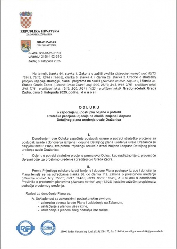Prostorno planiranje Arhiva: 9. sjednica Gradskog vijeća Grada Zadra Planovi na snazi U izradi Na javnoj raspravi Planovi u primjeni Natrag ODLUKU o započinjanju postupka ocjene o potrebi strateške procjene utjecaja na okoliš izmjene i dopune Detaljnog plana uređenja uvale Dražanica ODLUKU o započinjanju postupka ocjene o potrebi strateške procjene utjecaja na okoliš izmjene i dopune Detaljnog plana uređenja uvale Dražanica Natrag Objavljeno 07. studenog 2025. 14:52 Ispiši