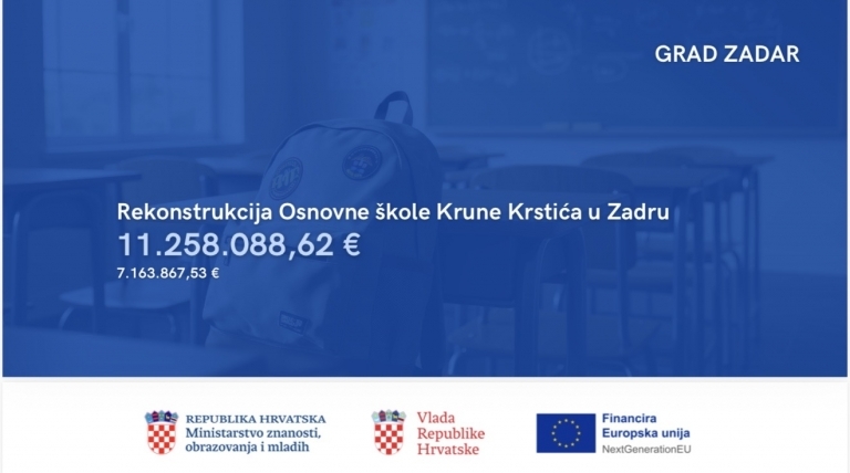 Za rekonstrukciju osnovne škole Krune Krstića Grad Zadar dobio je bespovratna sredstva u iznosu od 7.163.867,53 iz NPOO programa "Izgradnja, rekonstrukcija i opremanje osnovnih škola za potrebe jednosmjenskog rada i cjelodnevne škole."
