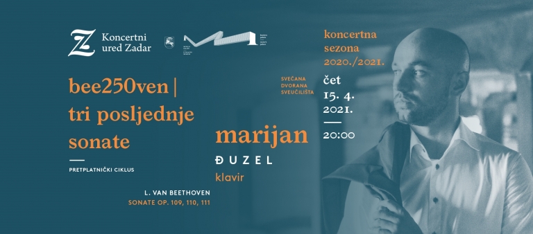 Kao pedesetogodišnjak, iako potpuno gluh, Ludwig van Beethoven je bio na vrhuncu kreativne moći. Skicirao je neka od svojih najvećih djela: Missu Solemnis, Varijacije na Diabellijevu temu i Devetu simfoniju. Nakon toga se, u proljeće 1820., vratio svojoj omiljenoj formi – klavirskoj sonati – i u sljedeće dvije godine napisao svoje tri posljednje sonate. Izvest će ih istaknuti hrvatski pijanist mlađe generacije Marijan Đuzel, koji će nastupiti u Pretplatničkom ciklusu u četvrtak, 15. travnja u Svečanoj dvorani Sveučilišta s početkom u 20 sati.