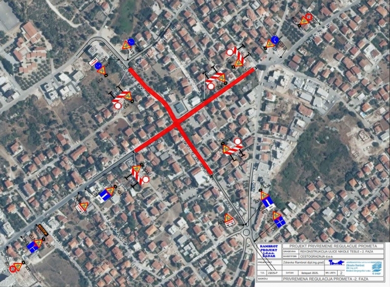 Obavještavaju se vozači u cestovnom prometu da će zbog izvođenja radova, društva Cestogradnja d.o.o., na rekonstrukciji raskrižja Ulice Nikole Tesle s Ulicom admirala Jakova Šubića od Cezana i Ulicom biskupa Jurja Dobrile u Zadru, na snazi biti privremena regulacija prometa.