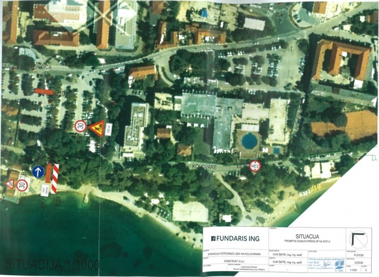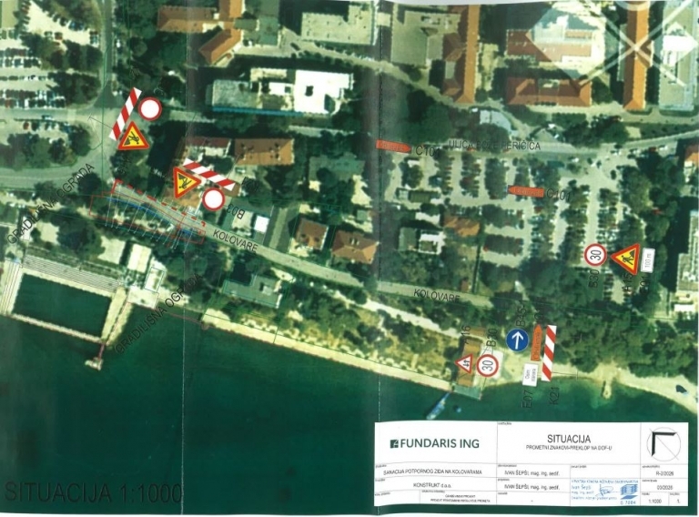 Obavještavaju se vozači u cestovnom prometu da će zbog izvođenja radova društva Konstrukt d.o.o. na sanaciji potpornog zida na Kolovarama u Zadru, od dana 29. travnja 2026. (srijeda) s početkom u 8,00 sati do 6. lipnja 2026. na snazi biti privremena regulacija prometa.