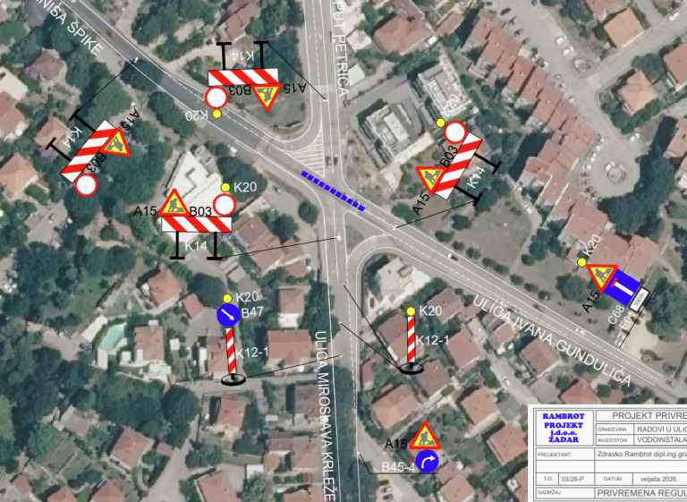 Obavještavaju se vozači u cestovnom prometu da će zbog izvođenja radova društva VODOINSTALACIJA d.o.o. iz Zadra na izgradnji glavnog kolektora visoke zone u raskrižju ulica Denisa Špike, Miroslava Krleže, Put Petrića i Ivana Gundulića u Zadru, od dana 27. travnja 2026.g.(ponedjeljak) na snazi biti privremena regulacija prometa. Predviđeno trajanje radova je do 1. lipnja.
