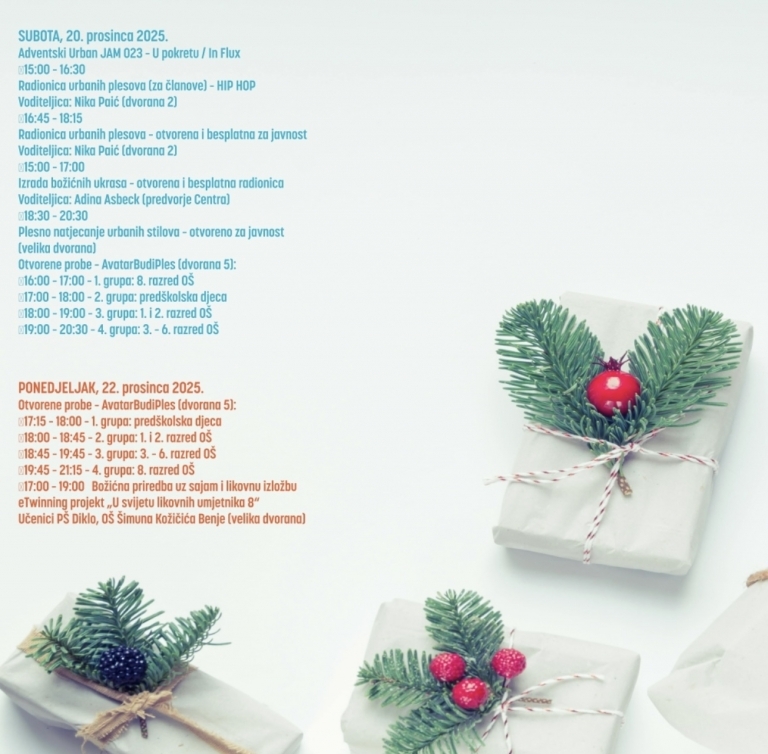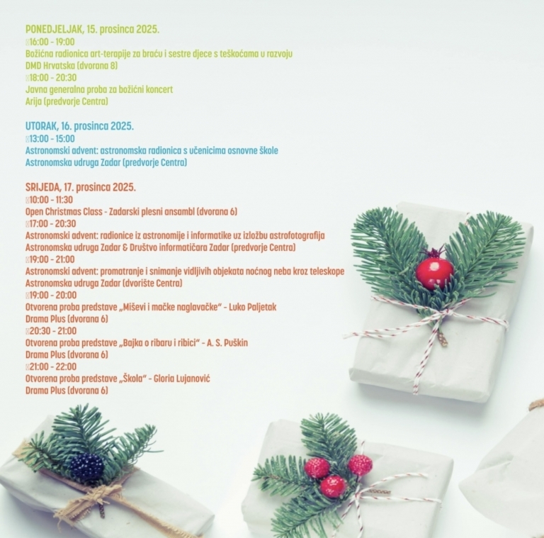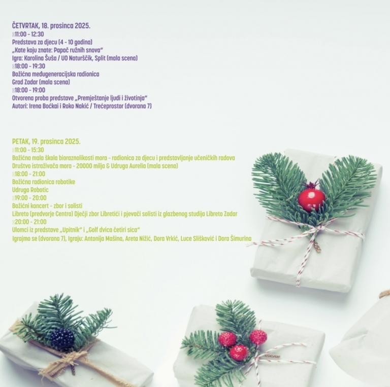 Uoči božićnih blagdana, Centar za mlade Zadar priprema bogat i sadržajan program namijenjen mladima i svim zainteresiranim građanima. Centar otvara svoja vrata kroz radionice, predstave, koncerte, plesne i edukativne programe te još jednom potvrđuje da je mjesto susreta, kreativnosti i zajedništva.