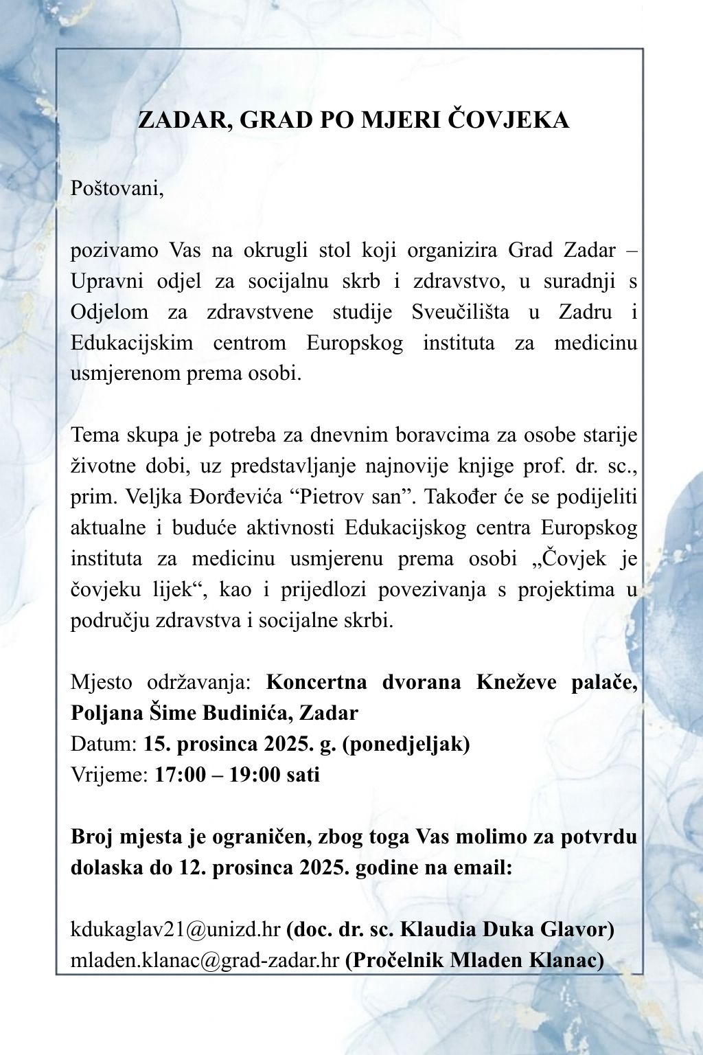 Broj mjesta je ograničen, zbog toga Vas molimo za potvrdu dolaska do 12. prosinca 2025. godine na email: