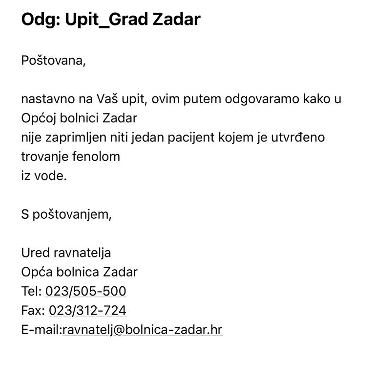 Iz Opće bolnice Zadar jasno kažu kako nisu zaprimili niti jednog pacijenta kojem je utvrđeno trovanje fenolom iz vode. Isto potvrđuju i u Zavodu za javno zdravstvo navodeći kako u niti jednom uzroku nije utvrđena prisutnost fenola.