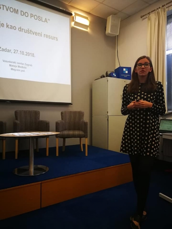 Hvala Mateji Medologije, mag.soc.pol., iz Volonterskog centra Zagreb koja se odazvala našem pozivu te nam predstavila koncept korporativnog volontiranja koji tek treba zaživjeti u gradu Zadru.